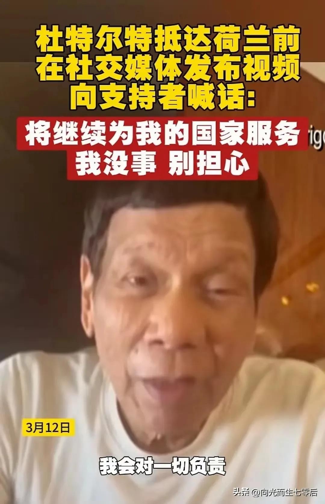 在飞机上,杜特尔特在社交媒体脸书个人页面发布视频,向支持者发表讲话。他在视频中表示:“我一切安好,请不要担心。这将是一场漫长的法律诉讼。我告诉你们,我将继续为我的祖国服务。如果这是我的命运,那我会坦然接受。”