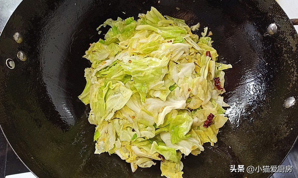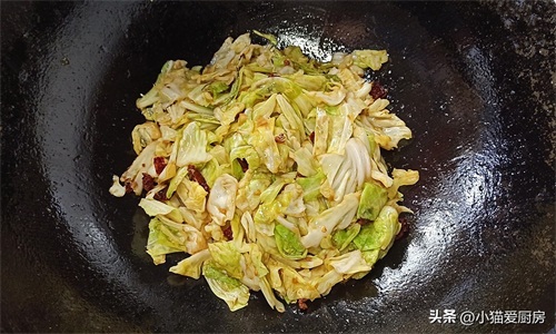 (3)炒包菜时,全程需要中大火爆炒,这样可以使包菜快速地炒熟,而且还能避免包菜中水分的流失,从而使包菜吃着更嫩更脆,炒的时间不要久,炒至八分熟就好。