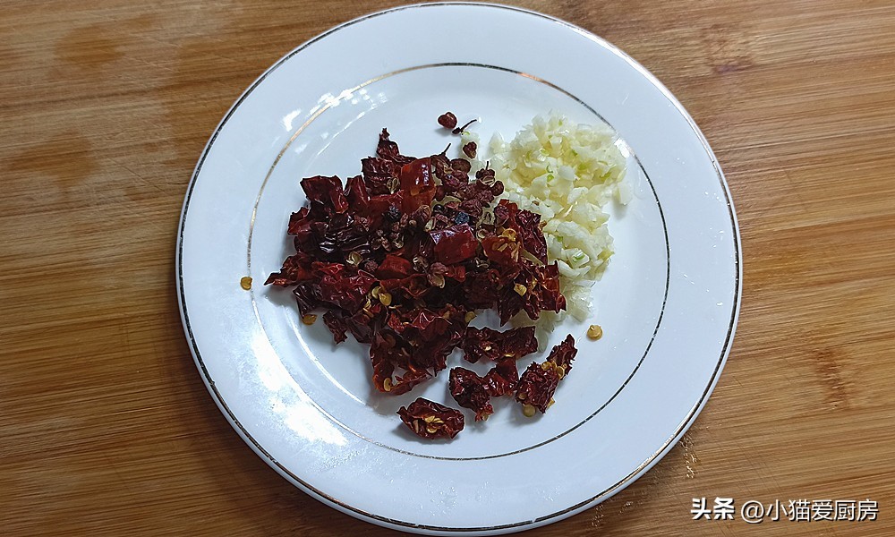 【步骤二】:把大蒜拍碎切成蒜末、干辣椒切成小段,再放入十几粒花椒备用。