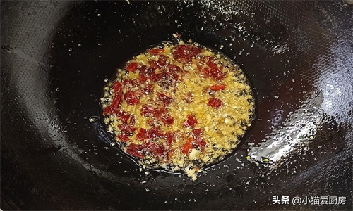 【步骤三】:将锅烧热放入半勺植物油,同时再放半勺猪油,把猪油烧化后,放入大蒜末、干辣椒、花椒粒,小火炒出香味。