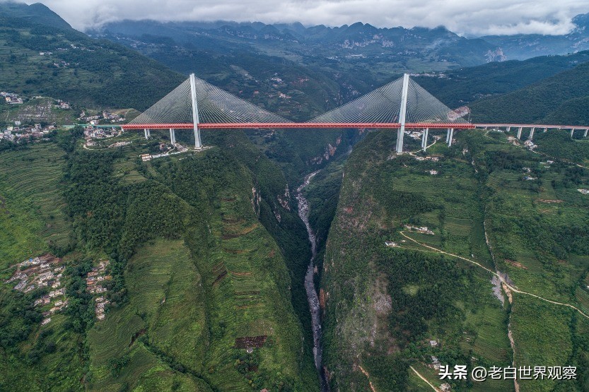 北盘江第一桥,桥面到谷底垂直高度达565米,相当于200层楼高,不仅创下中国桥梁高度之最,亦是世界最高桥梁