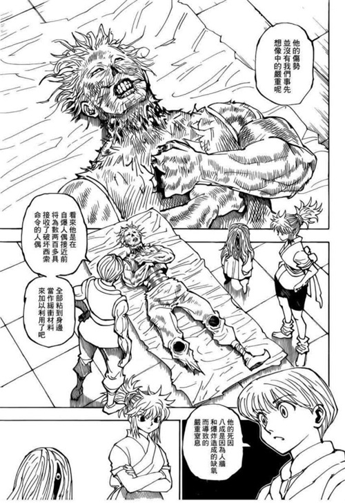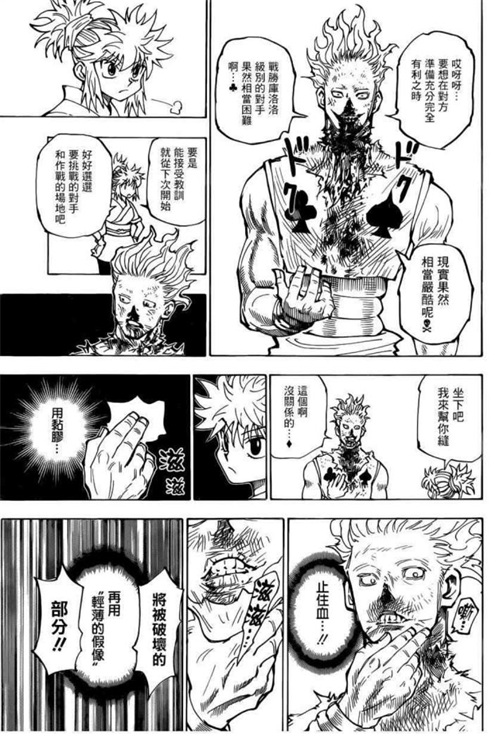 复活后的西索利用轻薄的假相使自己看起来完好无缺,刚站稳就去找旅团的成员复仇,甚至还当了回“厕所战神”(不知道这个梗的小伙伴可以去百度嗷),不得不让人感叹,不愧是西索,简直打不死的小强。
