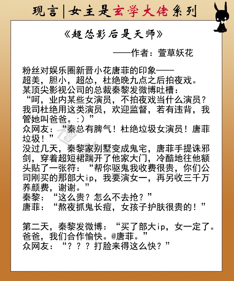 小短评:爽感十足的的玄学文,又带有时尚流行的娱乐圈元素。女主欺负鬼魂们让他们摆造型给她当模特儿的场面爆笑,女主和影帝谈恋爱的过程让人忍俊不禁,又甜又萌。