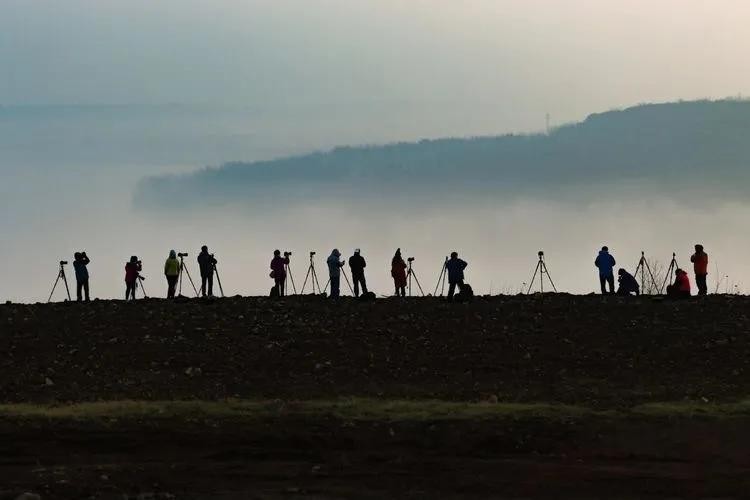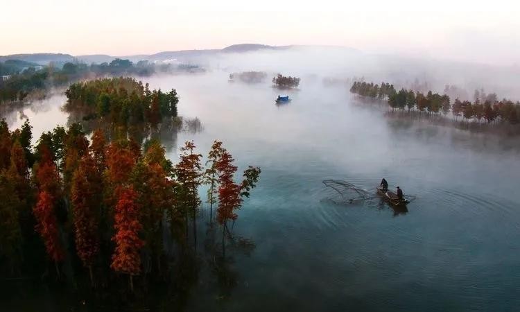 湖水、红杉、晨雾……逆光中,随手一拍,就是一幅画。