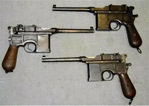 驳壳枪真名叫毛瑟枪,是德国在1896年推出的一款半自动手枪,清朝末期流入中国,直到抗战结束一直活跃在中国战场上。枪身长28厘米,重1.24公斤,弹容量20发,因此俗称为“二十响”。它使用7.63毫米弹径子弹,最大射程150米,理论射速可达900发/分钟,和普通手枪比,它具有射程远、火力猛、射速快等诸多优点,深受八路军喜爱。