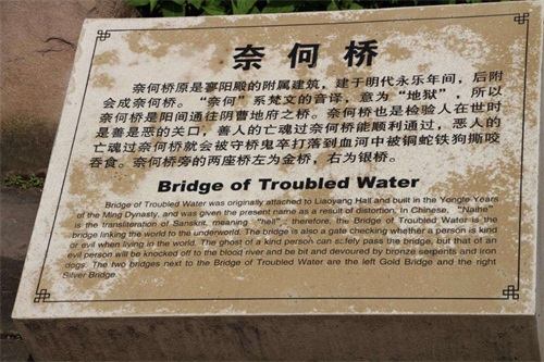 早在几百年前,民间地府的传说逐渐将冥府鬼都确认在重庆市丰都县。在丰都县鬼城里主要有奈何桥,鬼门关,黄泉路,十八层地狱等景点。其中奈何桥为并列的三座石拱桥,均建于平地,大小、形状也完全相同,桥宽四尺,两侧以雕花石栏,桥面略呈弧形。有兴趣的话,可以去看看,走下黄泉路,过过奈何桥,体验一下“阴曹地府”一日游。