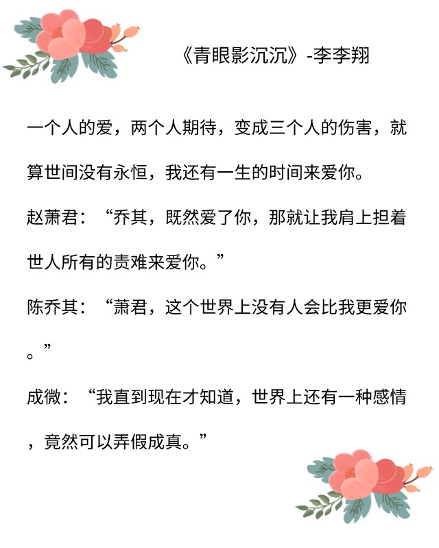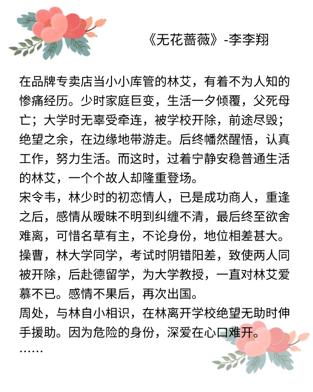 点评:《无花蔷薇》是一个悲剧,宋令韦有女朋友,林艾出国学习,两个人没在一起,这是很多人的意难平。一直等着作者的番外,但一直没有成行。