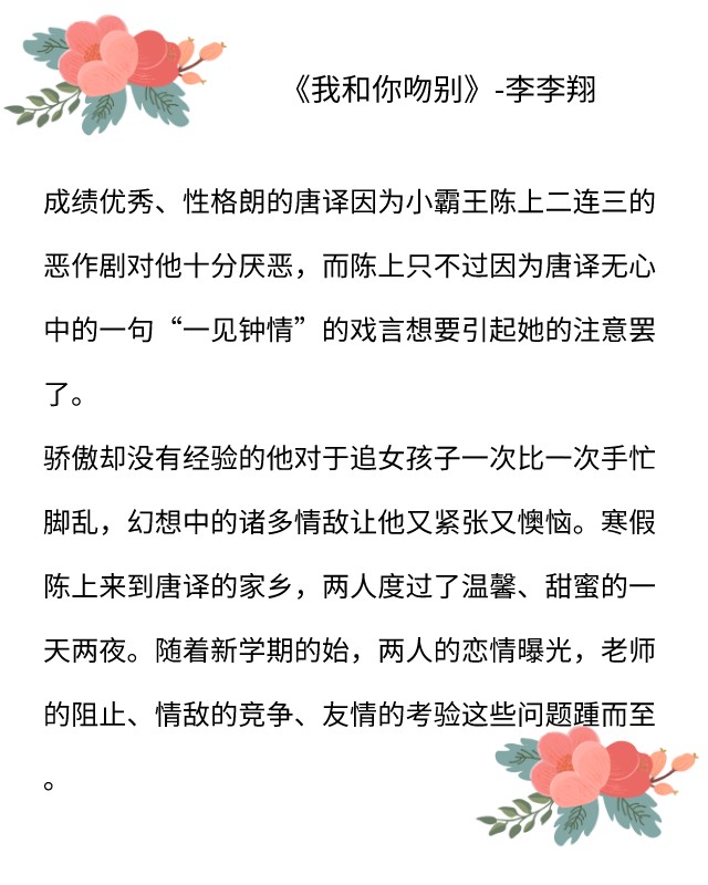点评:《我和你吻别》是李李翔作品里,堪称最甜的了。因为这书里男女主角一直爱的都是对方,男主从一而终爱的更是那一个人。