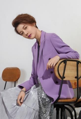 这张照片里的车晓,一件紫色的西装外套,里面一件亮晶晶的裙子,而且她还涂了一个紫色的口红。这种色号可是很难驾驭的,但是涂在车晓的嘴上却是那么的好看。整个人看上去酷帅中带着一点俏皮。把这两种风格完美结合,真的是很让人佩服。