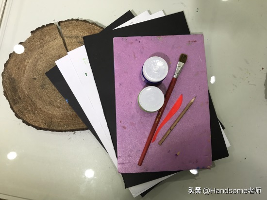 材料准备:吹塑纸、黏土刻刀、铅笔、水粉颜料、水粉笔、卡纸。