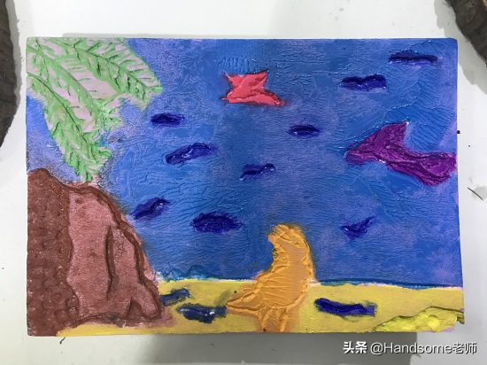 第五步:上色。在吹塑纸板上涂上彩色,按照自己的意愿上色即可。依旧是需要多用颜料,要多、要厚。