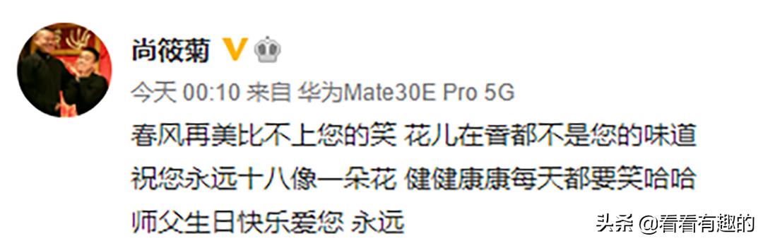 反观,岳云鹏的另外两个徒弟尚筱菊和刘筱亭,他们都在岳云鹏生日的那天准时准点送上了生日祝福,刘筱亭没有跟师父岳云鹏的合照,至少能打出“师父,生日快乐”五个字那就是尽孝了。