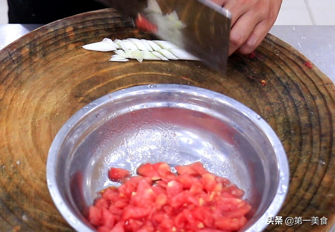 准备番茄一个,打上十字花刀,放在热水中烫一下,把外皮剥干净切成番茄丁。