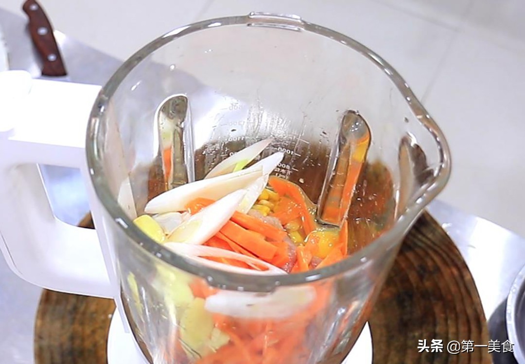 准备适量的肉末,大葱一段切成片,生姜一块也切成片,胡萝卜半个切成细丝,把鸡肉末和切好的葱、姜、胡萝卜一起倒入料理机中,也可以放一些玉米粒,口感更加香甜。