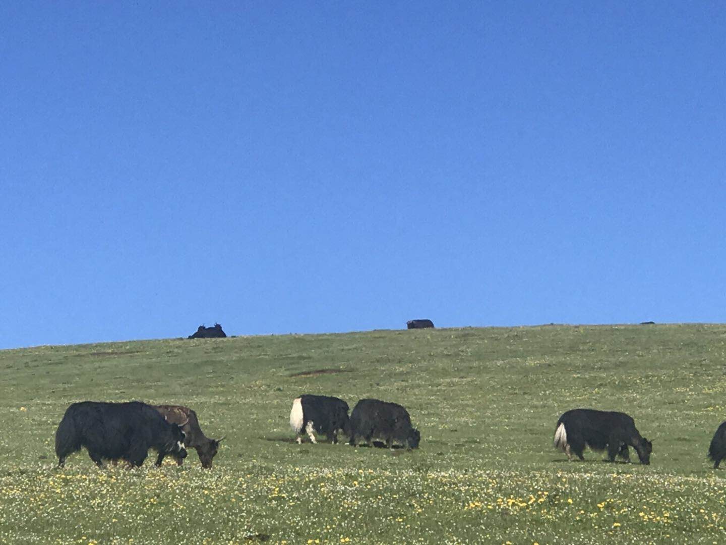 还是盘山路,不过景色依然很美,天很蓝,云很白,树很绿,山很青。颜色分明。朋友告诉我,每年到了朝圣的时候,很多虔诚的教徒都会三步一叩,一直到山上。