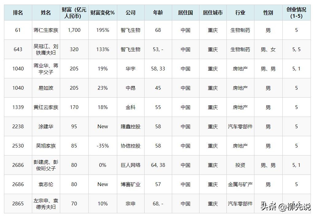 重庆市地处长江上游,地貌以丘陵、山地为主。因嘉陵江古称“渝水”,故重庆又简称“渝”。当地已形成全球重要电子信息产业集群和国内重要汽车产业集群,有不少优秀的企业家居住在这座城市。下面依据新发布的“2021胡润全球富豪榜”,来看看重庆上榜的富豪们。