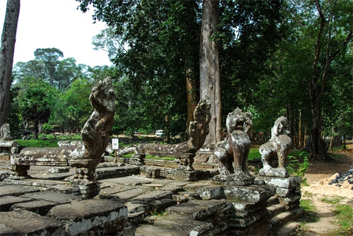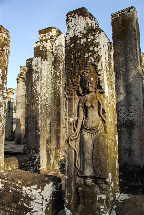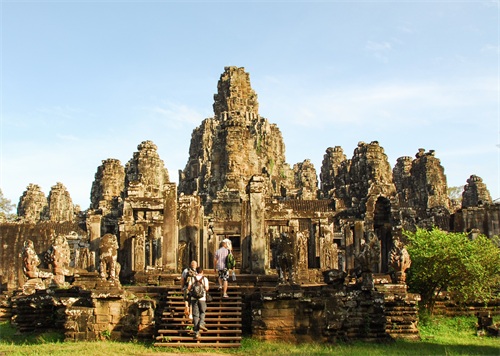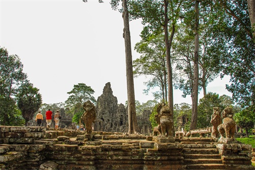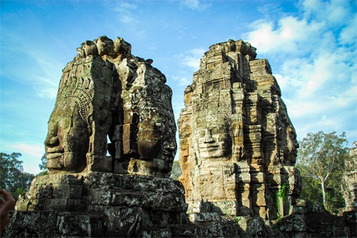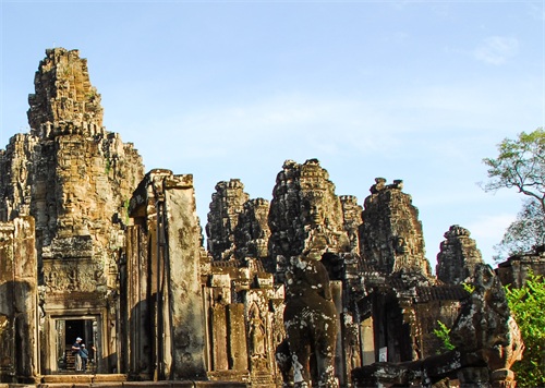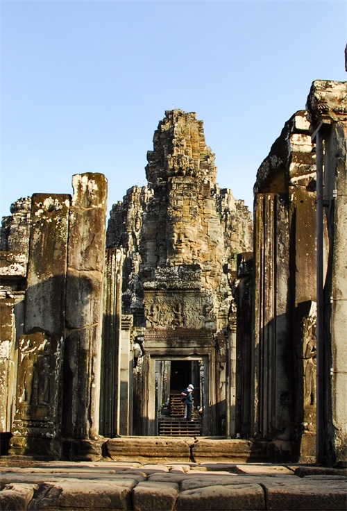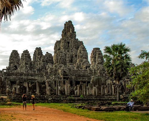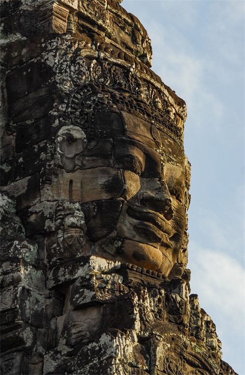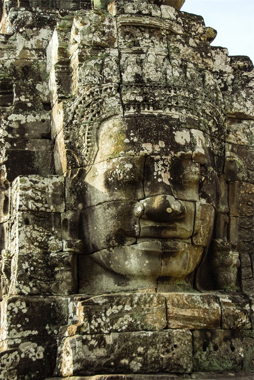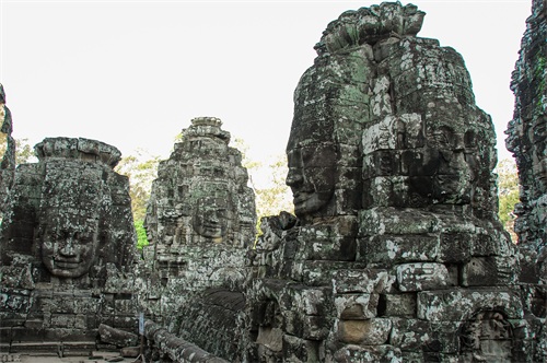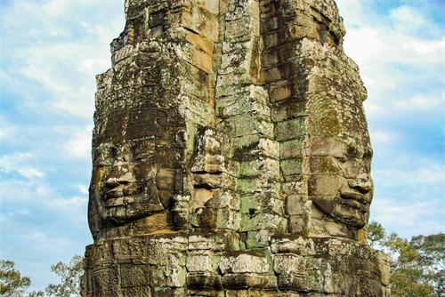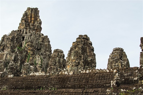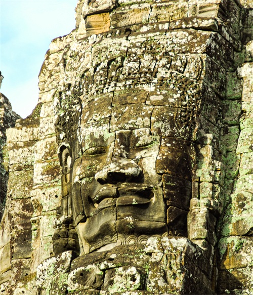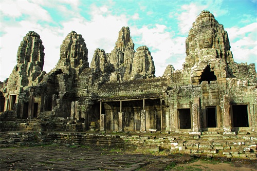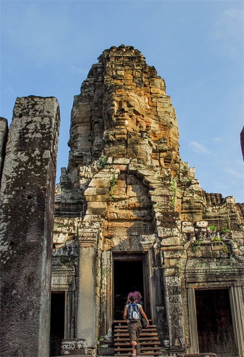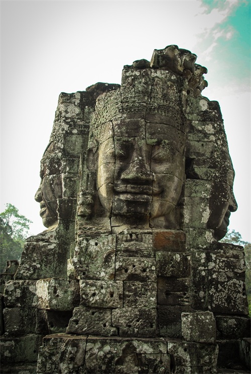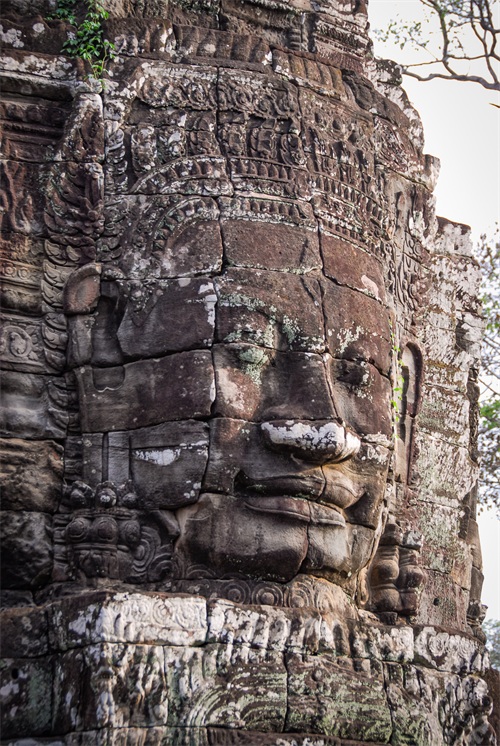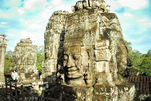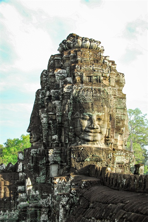吴哥窟享誉世界,来到其所在地,柬埔寨暹粒省暹粒市,这才知道,它又叫小吴哥,只是整个吴哥古迹(俗称大吴哥)中极小的一部分。吴哥古迹现存600多处,分布在面积400余平方公里的森林里。作为高棉最强盛王朝的都城,吴哥始建于公元802年,完成于1201年,前后历时400年。1431年,暹罗(今泰国)人打过来,吴哥王朝被迫迁都金边,由此,宏伟辉煌的政治中心、宗教中心、艺术中心渐渐被热带雨林吞噬湮没,成为废墟,直到19世纪中叶才重见天日。考古学家把它与中国的长城、埃及的金字塔和印度尼西亚的婆罗浮屠并称为东方四大奇迹。1992年,联合国教科文组织把整个吴哥古迹列入世界文化遗产名录。目前,世界各国都在共同努力,保护和修复这一人类文化瑰宝。早在1998年,中国政府就派遣专业队伍参与了其中周萨神庙的保护修复,现在又在开展二期工程——茶胶寺的保护修复。 巴戎寺,又译巴扬寺,是吴哥古迹中唯一一座大乘佛教国家寺庙。它的54座四面佛塔高耸入云,200余尊巨型佛面雕像微笑着向四面八方俯瞰苍生。这就是享誉世界的“高棉的微笑”。当然,这些曾经闪耀着金色光芒的微笑面孔多数已经难以辨认。
