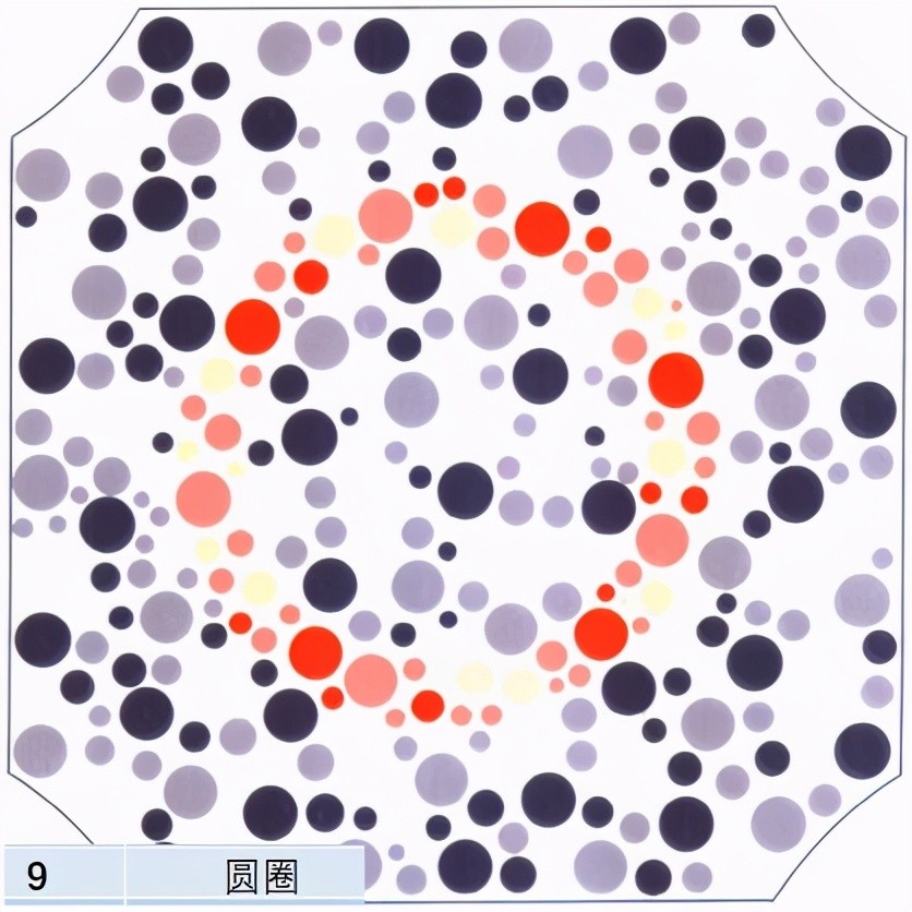 咱们首先来看一下第1幅图。在这幅图中我们可以看到的有很多颜色的圆点,但是我们需要识别的图形,它其实是一个扇形,它和背景颜色还是有着色差的,如果不是严重的色弱是可以识别出来的。
