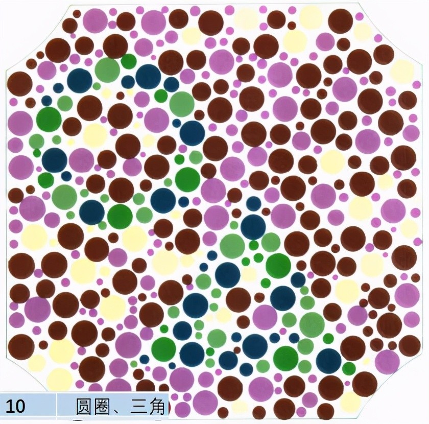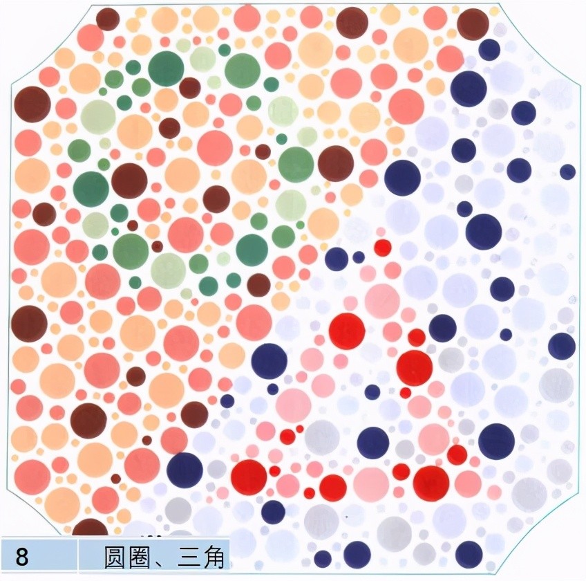 第4张图相对于来说属于中等偏上的难度,虽然我们需要识别的圆圈和三角形,它们和背景颜色存在很大的色差。但是对于对色觉不是特别敏感的小伙伴,很容易被其他的颜色混淆,从而影响视觉上的判断。