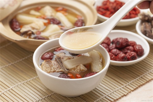 3. 花旗参淮山杞子煲瘦肉:花旗参、淮山药分别切片备用;猪瘦肉切成小块,焯水去浮沫备用。将所有材料放入炖盅里,加适量水和调味料(如生姜、料酒等),用中火炖煮2小时左右,直到汤汁浓稠即可。这款汤品具有补气健脾、滋阴润燥的作用,适合体弱多病的人食用。