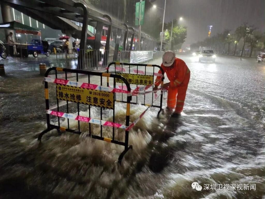 9月7日晚,深圳龙岗一处积水点出现井盖顶托,龙岗排水工作人员现场值守。深圳卫视深视新闻 图