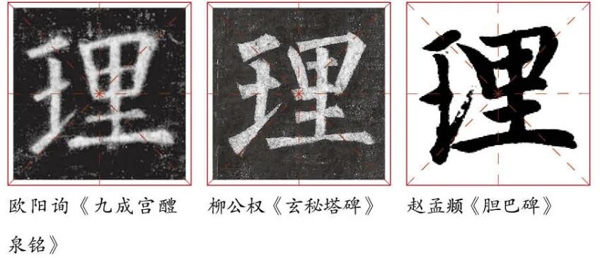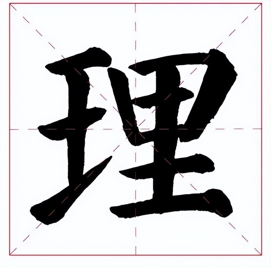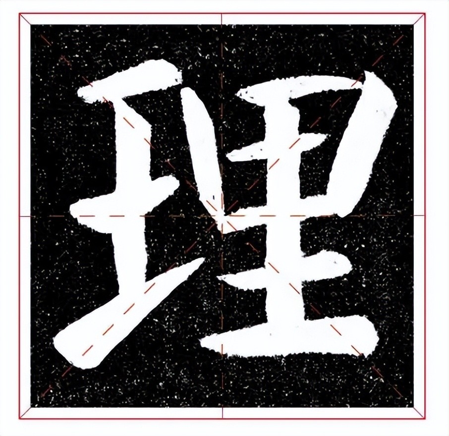 “理”字外形方正,左窄右宽。左边稍长,两横一提间距大致相近;右边横画长短不一,间距均匀。左右两部分避让迎就,融为一体。