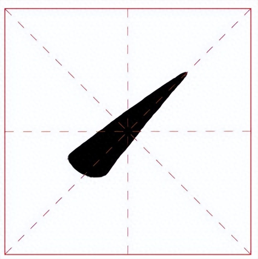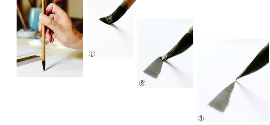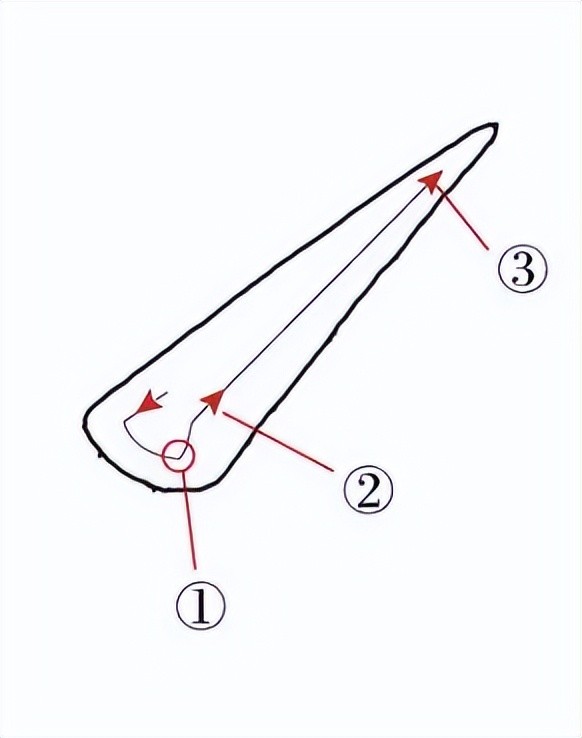 提画的运笔从左下方朝右上方逐步向上提起,由粗重变轻细,直至离开纸面。