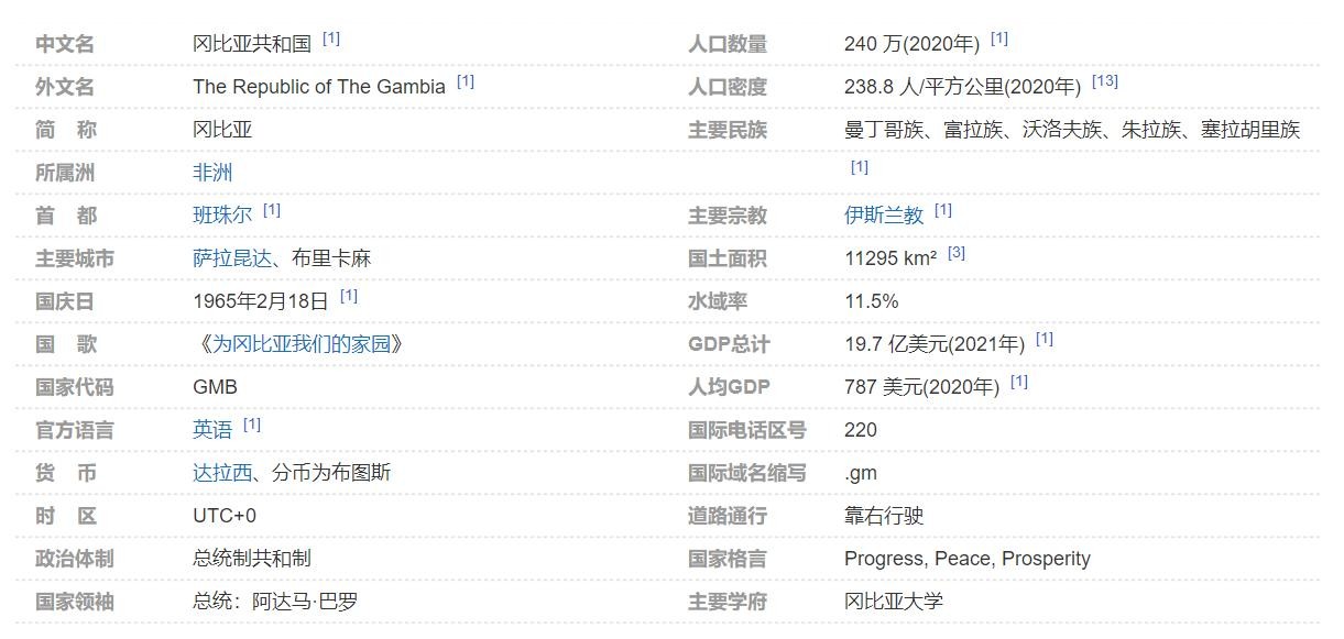 冈比亚共和国(The Republic of The Gambia),简称冈比亚(Gambia),中国台湾翻译为甘比亚。位于非洲西部大西洋沿岸地区,它西邻大西洋,北、东、南三面被塞内加尔紧紧包围,属热带草原气候。