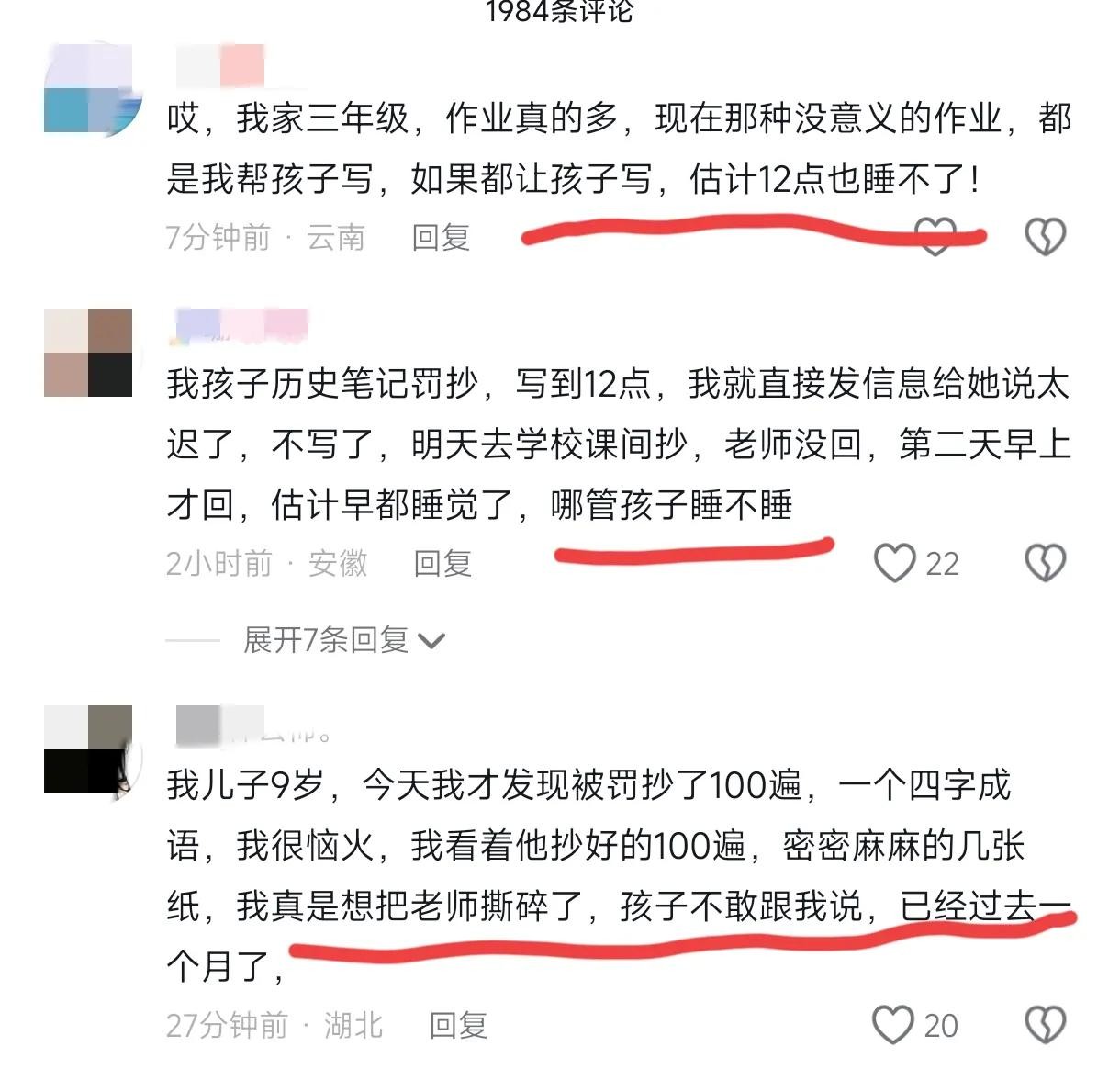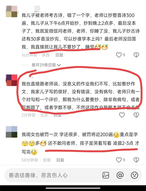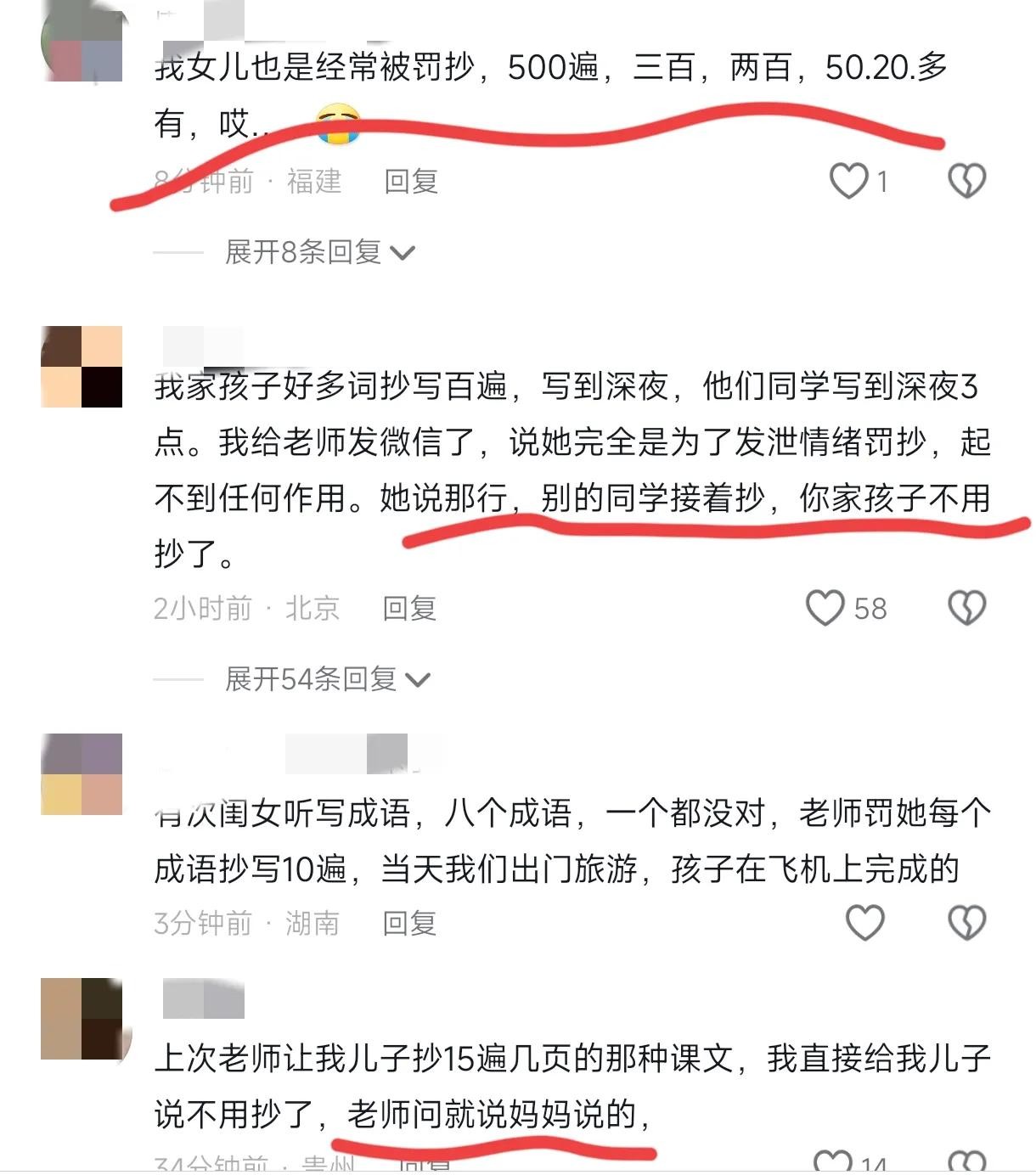 很多家长说自己的孩子都有过类似经历,一些普通的家长就可能陪着孩子默默承受抄写到深夜,还有一些勇敢的家长认为孩子太小不能应该承受这么大压力,所以直接拒绝老师的罚抄,让孩子充分休息。