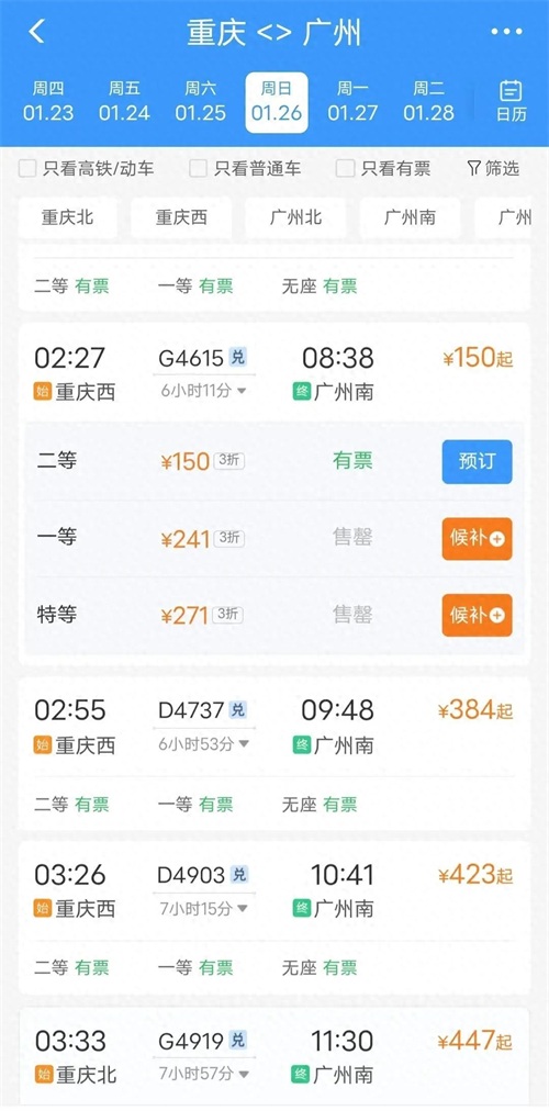 1月14日,一网友在社交平台上晒出12306铁路购票APP的购票页面截图。截图显示,1月26日,一趟由重庆开往广州的高铁票价优惠至3折,二等座仅需150元,一等座需241元,特等座需271元。“太吸引人了。”该网友表示,正考虑改变原有的出行计划,带孩子去广东过年。