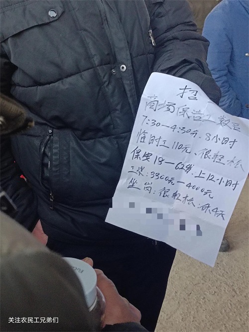 还有一位老板是来找商场保安,保洁的。听这位老板介绍说,保洁工上班时间是八个小时,工资是110一天。这个活很轻松,一点都不累。
