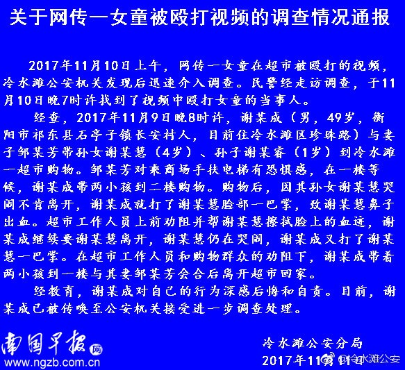 11月12日下午,冷水滩公安发布案情通报,经法医鉴定,遭掌掴女童谢某慧构成轻微伤。