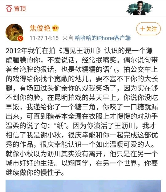 高以翔去世后,焦俊艳发文表示对他的遗憾,她表示很庆幸自己能认识如此温暖可爱的高以翔,也希望以翔同学在另一个世界继续做慢性子。