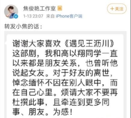 1月13日晚焦俊艳工作室代表焦俊艳再次发声,强调两人的朋友关系,希望大家不要再杜撰,影响高以翔先生及其家人。