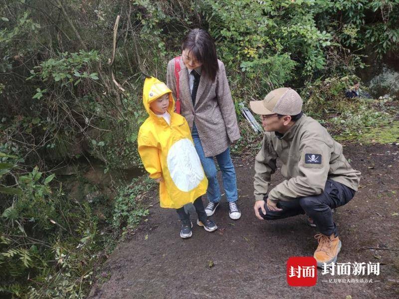 10月1日,5岁的杨哲睿和家人在山石上看“鸡脚印”