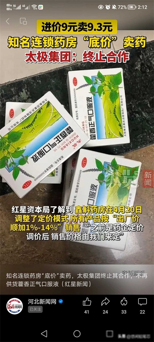 太极藿香正气口服液的价格问题成为了众人关注的焦点。最近,一家名为鑫斛药房的知名药店调整了销售策略,将所有药品的价格都提高了1%到14%不等,这一举动引起了太极集团的不满,立即停止了向该药店供货。