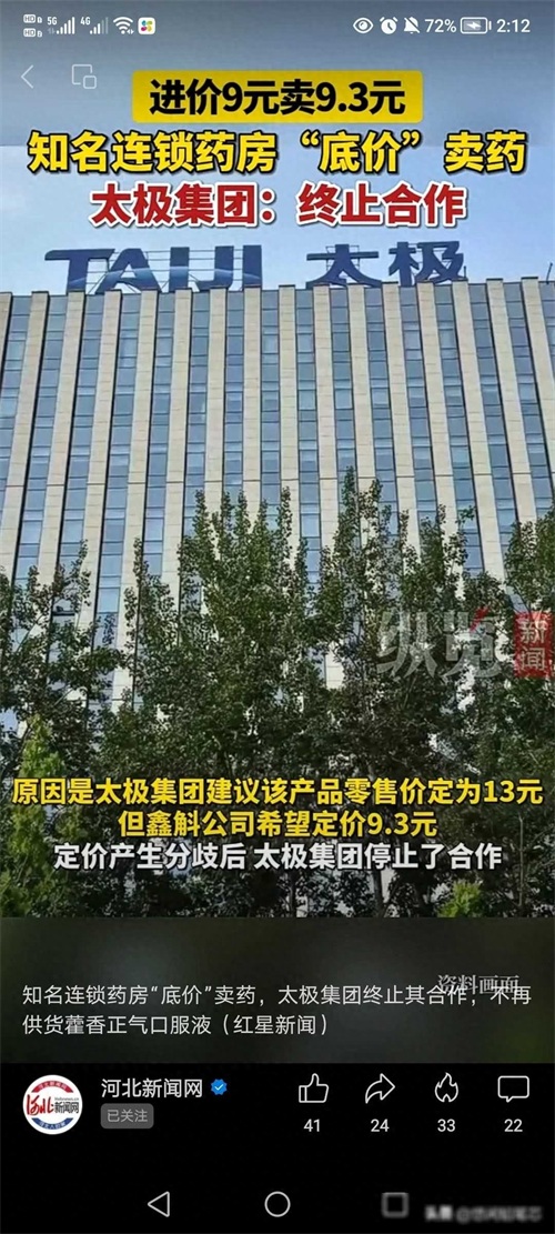 捅了马蜂窝了!太极藿香正气口服液,出厂价9块,知名药店卖9.