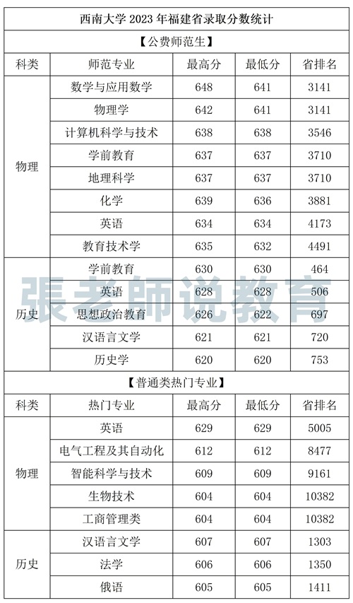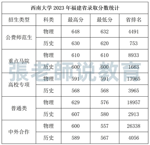 西南州大学2023年在福建省招生批次有提前批和本科批,录取类型主要有普通类、体育类和艺术类等,其中物理组录取最高分648(省排名2303),录取最低分557(省排名26338);历史组录取最高分630(省排名464),录取最低分567(省排名4056)。