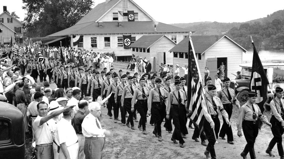 1936 年 7 月 18 日,近千名着制服者戴着万字符臂章、挥舞着纳粹横幅游行经过新泽西某看台。