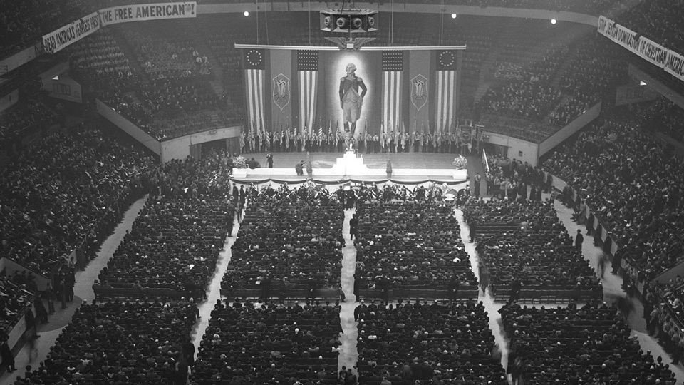 约两万名群众参加了 1939 年 2 月 20 日于纽约市麦迪逊广场花园举行的德美联盟集会(贝特曼档案/盖蒂图片社)