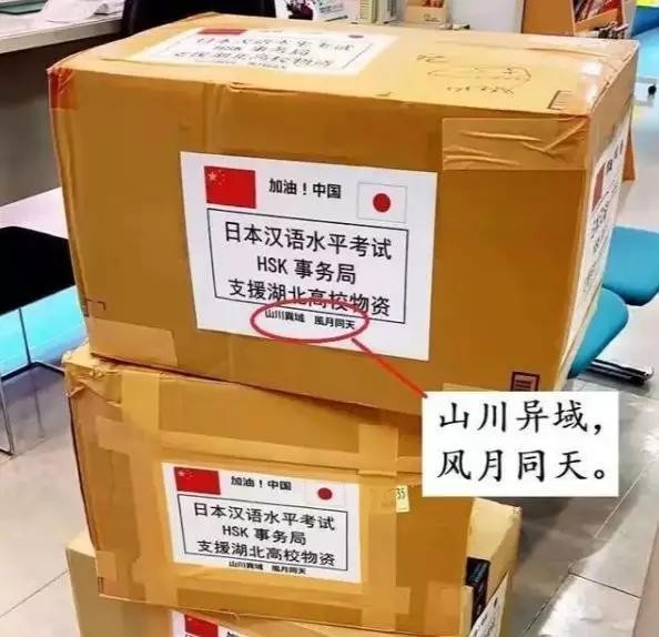 2020年新冠疫情爆发,日本对中国进行了物资援助,援助物资上写着“山川异域,风月同天”。