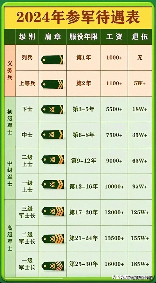 2024参军待遇对照表,家里有孩子当兵的,赶紧收藏看看吧。 2026-03-31 17:41 点击: 来源:高饶网 摘要:2024参军待遇对照表,家里有孩子当兵的,赶紧收藏看看吧。 2024参军待遇对照表,家里有孩子当兵的,赶紧收藏看看吧。 相关标签: 上一篇:8年以上车龄加入网约车平台的有效方法! 下一篇:车厘子为什么那么贵?