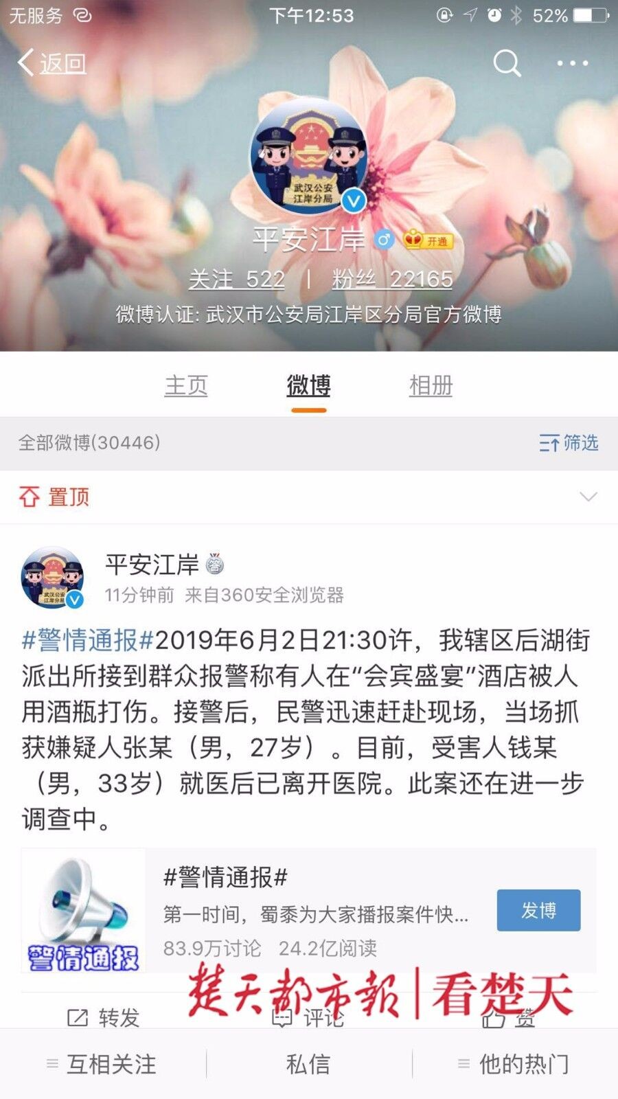 昨日,平安江岸发布通报称,前晚民警接警后赶赴现场,当场抓获嫌疑人张某(男,27岁)。目前,受害人钱某(男,33岁)就医后已离开医院,此案还在进一步调查中。