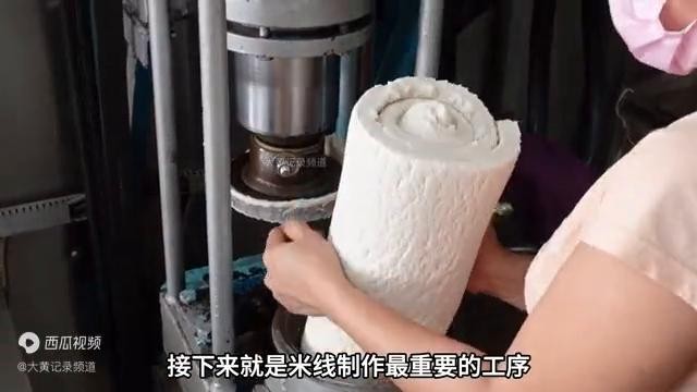 7. 接下来就是米线制作最重要的工序,通过这台液压机压成细细的米线。老板虽然工厂不大,但用的都是真材实料,也都是纯米浆制作而成,没有任何科技与狠货。