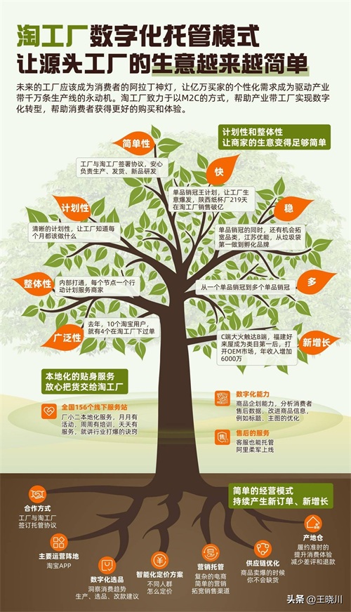 淘工厂入口设在淘宝APP,对源头工厂来说,这样不仅可以解决远离市场、缺乏渠道的难题,还让源头工厂以最小成本实现工厂数字化。目前,作为淘宝天猫集团为源头工厂倾力打造的平台,淘工厂可以给源头工厂提供数字化选品、智能化定价、营销托管、供应链优化、物流和本地化服务等六大托管服务。这些对源头工厂来说恰到好处!