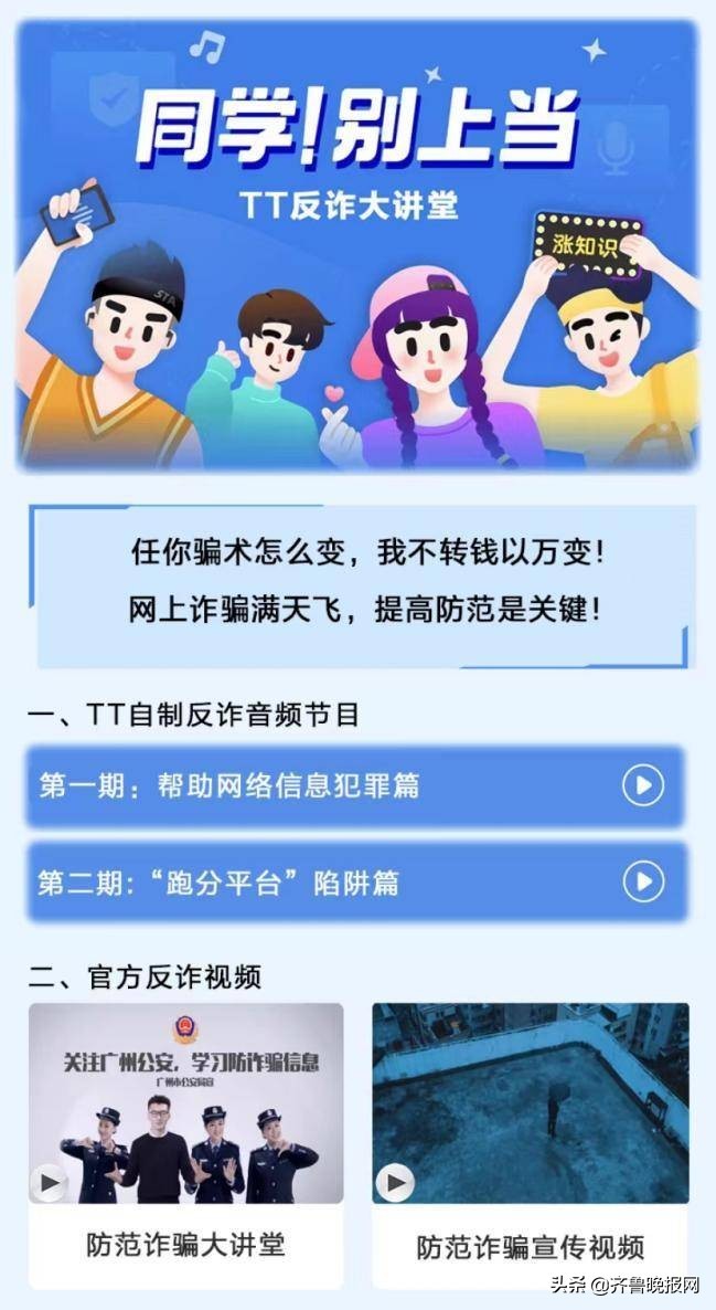 近年来,信息技术发展推动了互联网的普及和用户规模的扩大,防范电信诈骗成为社会关注的一项重要议题。TT语音积极履行企业社会责任,在广州市公安局的指导下开设了《同学!别上当》反诈骗专栏,通过科普的方式帮助用户提升互联网自我安全意识和防范意识,充分发挥语音社交平台的正向价值,为用户打造清朗健康网络。