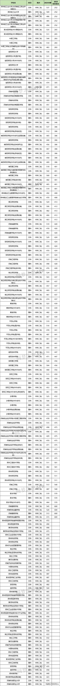 2023年全国排名第252,在河南省最低分为文科537分、理科485分,理科分数超过河南省二本线分数。
