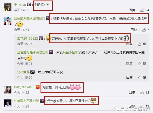 “全能型科科”、“唱的很好很暖,谢谢哥哥给我们的礼物。只是,墨镜我实在无法理解了”、“戴上滤镜还可以吹”