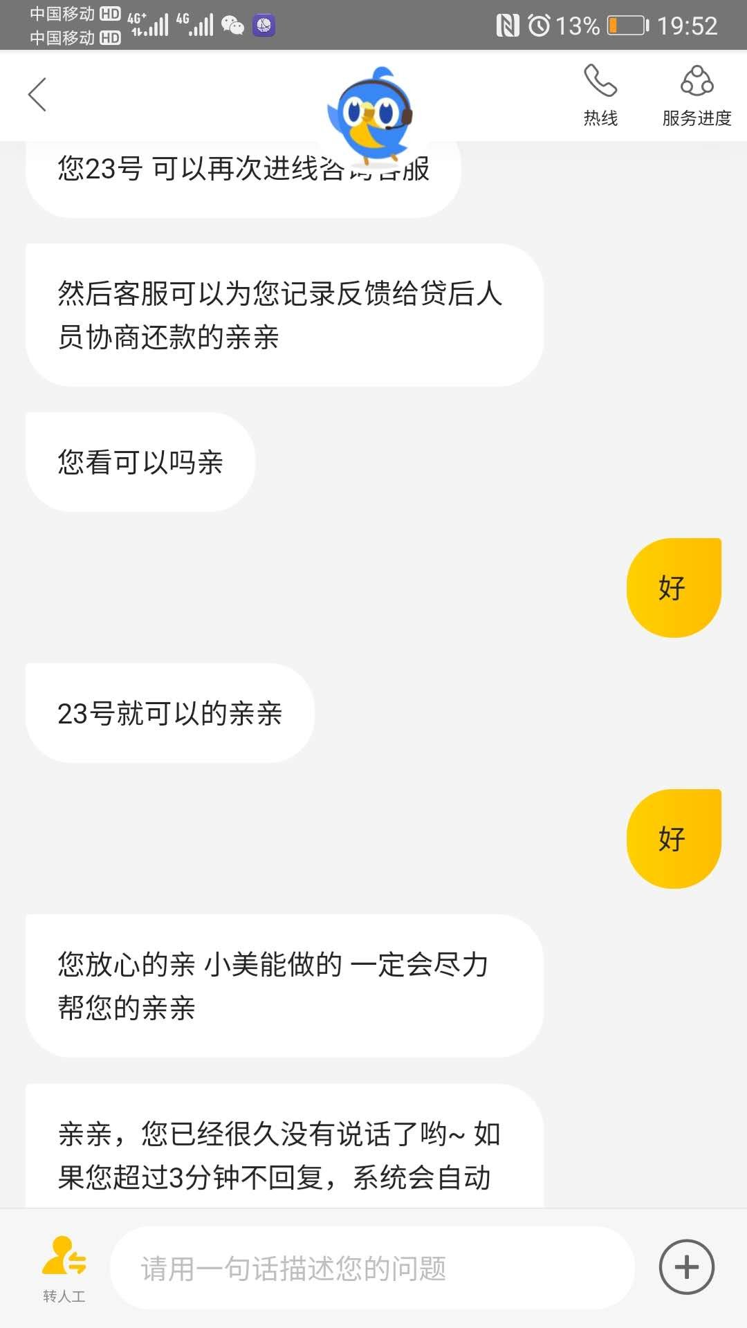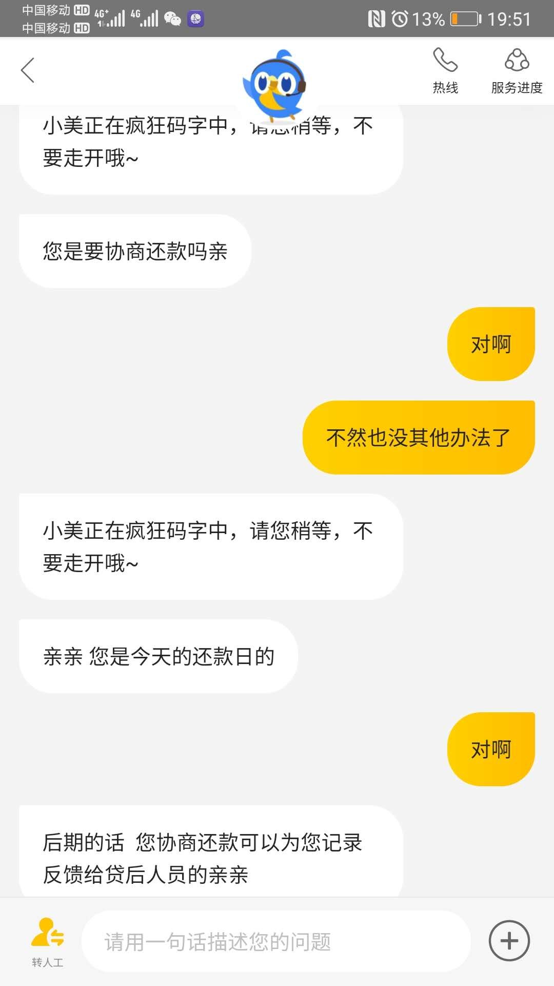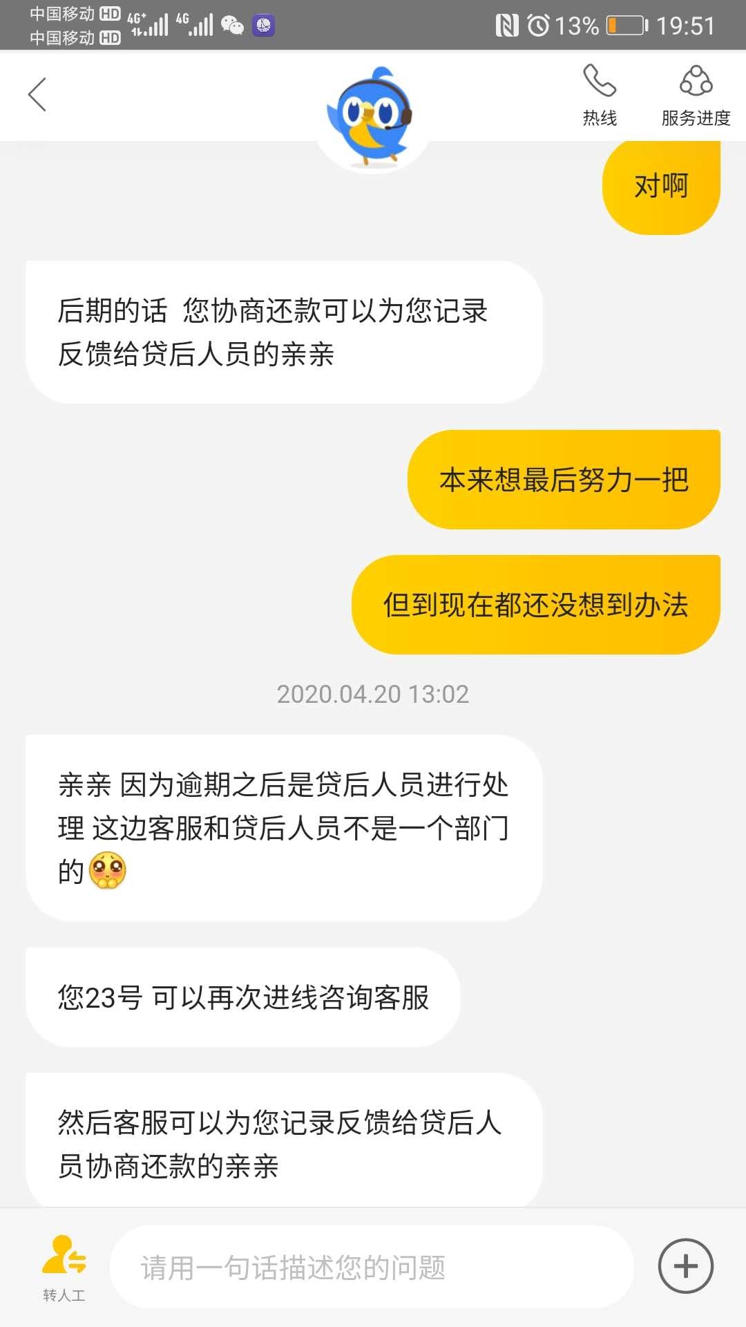 因疫情原因,收入减少,想尽了一切办法无法还清美团于4月20日到期的账单。主动联系客户寻求协商延期还款,客服的答复是逾期了,会有其他部门联系协商还款,不用担心。