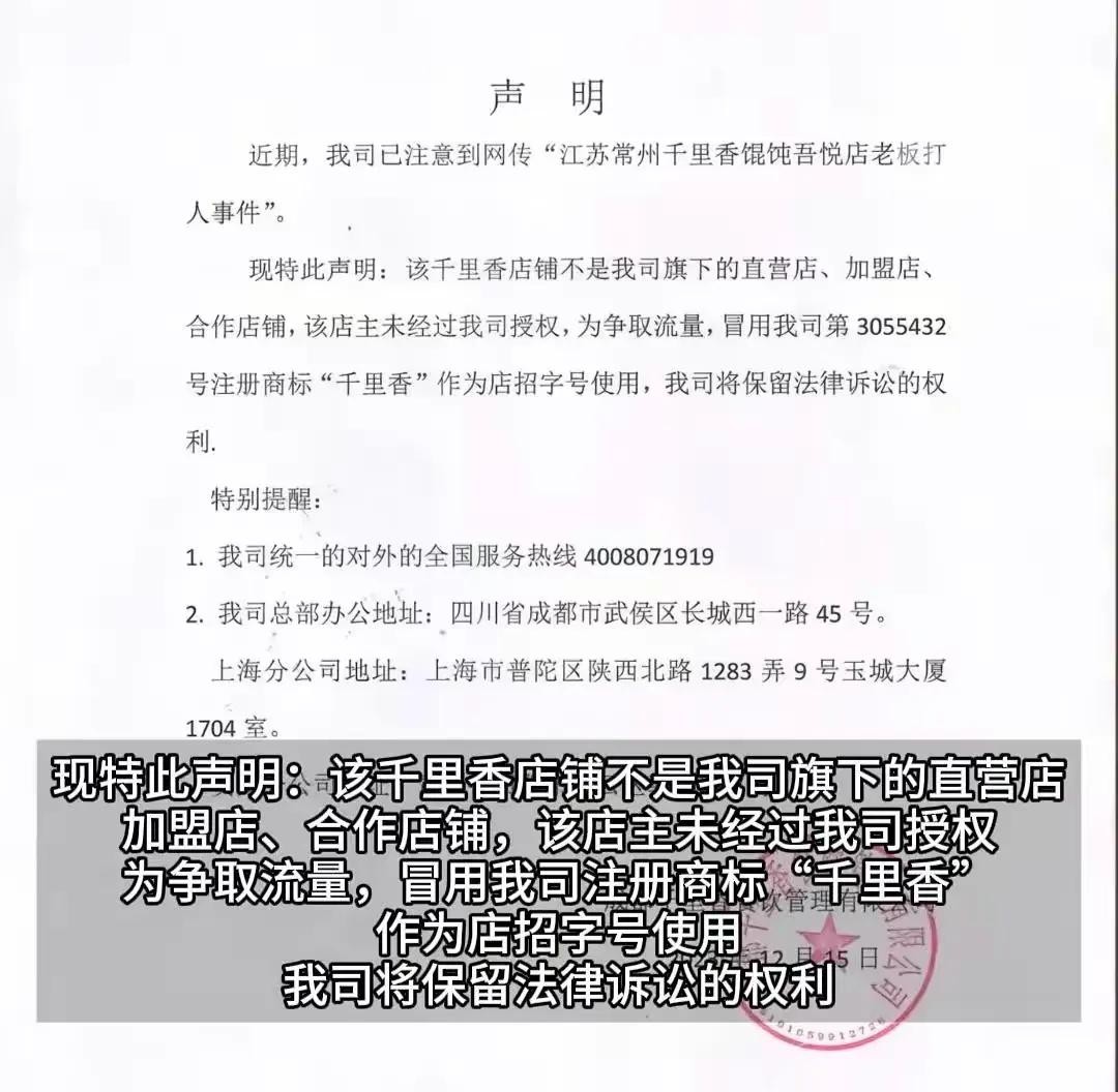 同时,连锁品牌千里香馄饨官方也对事件进行声明,称涉事店铺冒用注册商标,将追究法律责任。